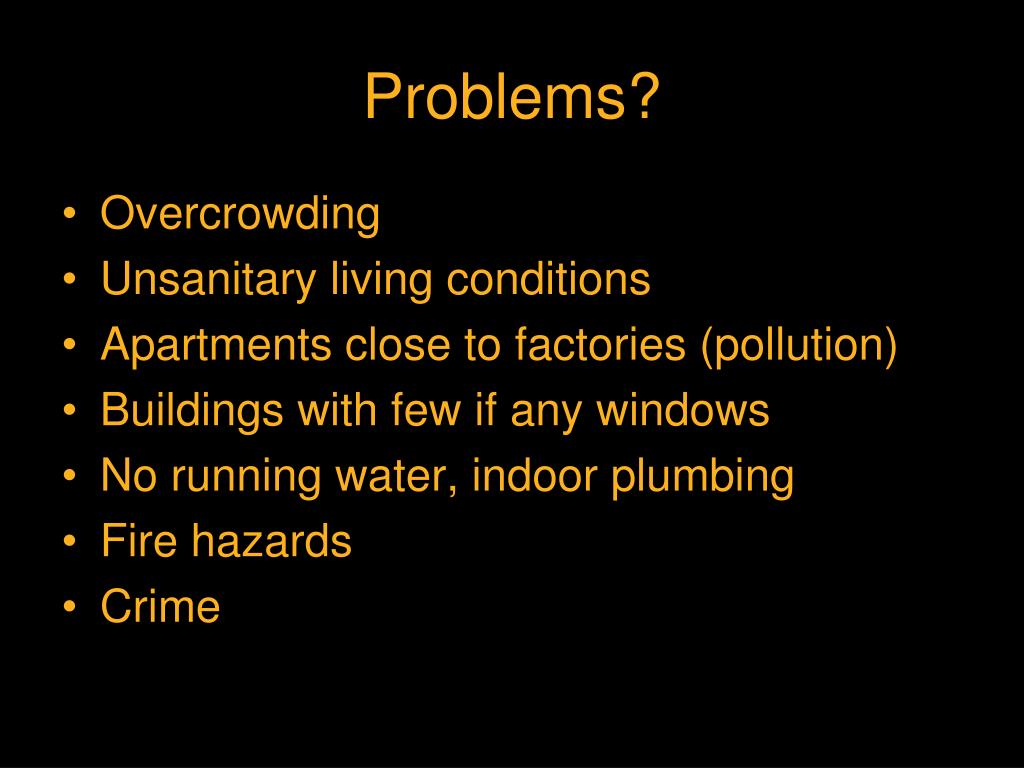Problems? • Overcrowding • Unsanitary living conditions • Apartments close to factories (pollution) • Buildings with few if any windows • No running water, indoor plumbing • Fire hazards • Crime