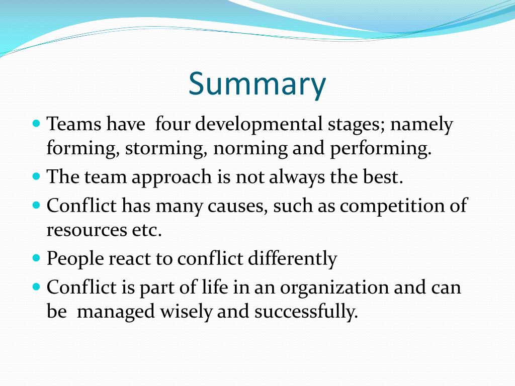 Summary • Teams have four developmental stages; namely forming, storming, norming and performing. • The team approach is not always the best. • Conflict has many causes, such as competition of resources etc. • People react to conflict differently • Conflict is part of life in an organization and can be managed wisely and successfully.