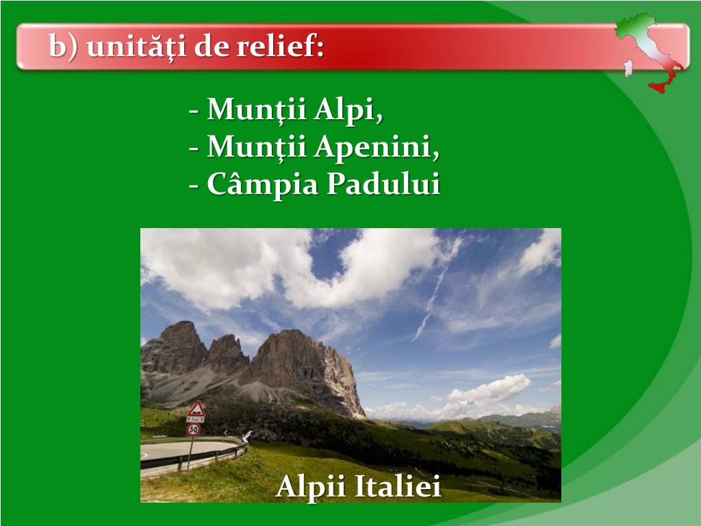 b) unităţi de relief: - Munţii Alpi, - Munţii Apenini, - Câmpia Padului AlpiiItaliei