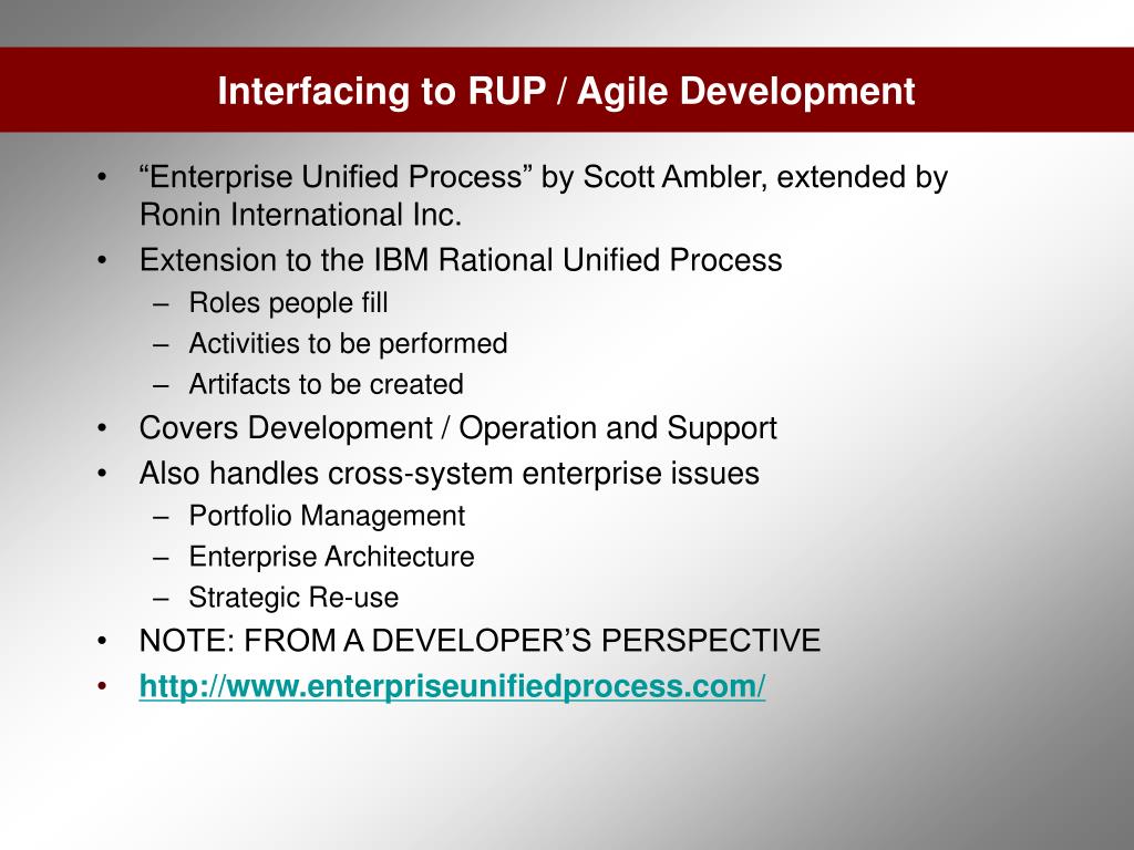 Interfacing to RUP / Agile Development • “Enterprise Unified Process” by Scott Ambler, extended by Ronin International Inc. • Extension to the IBM Rational Unified Process • Roles people fill • Activities to be performed • Artifacts to be created • Covers Development / Operation and Support • Also handles cross-system enterprise issues • Portfolio Management • Enterprise Architecture • Strategic Re-use • NOTE: FROM A DEVELOPER’S PERSPECTIVE • http://www.enterpriseunifiedprocess.com/