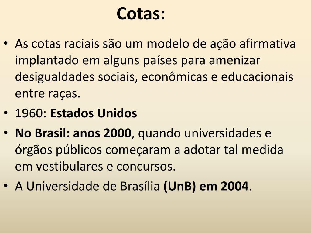 Cotas: • As cotas raciais são um modelo de ação afirmativa implantado em alguns países para amenizar desigualdades sociais, econômicas e educacionais entre raças. • 1960: Estados Unidos • No Brasil: anos 2000, quando universidades e órgãos públicos começaram a adotar tal medida em vestibulares e concursos. • A Universidade de Brasília (UnB) em 2004.