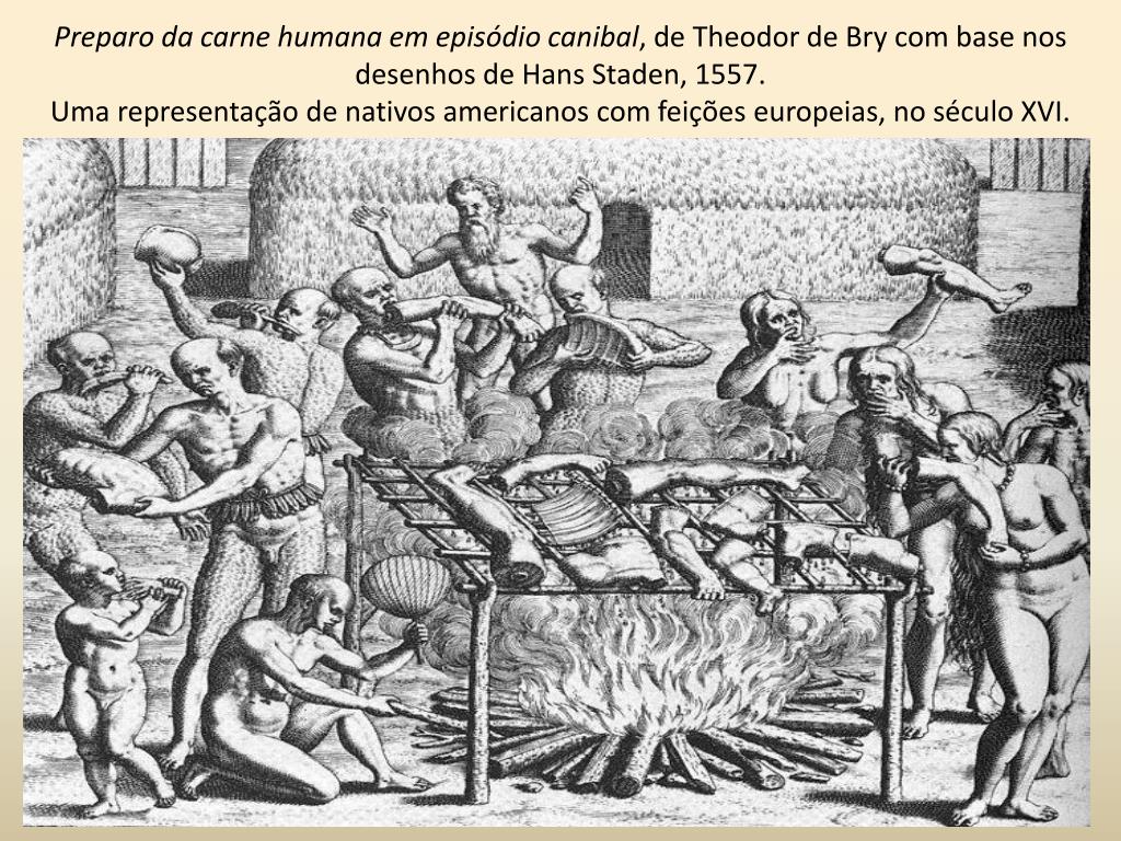 Preparo da carne humana em episódio canibal, de Theodor de Brycom base nos desenhos de Hans Staden, 1557.Uma representação de nativos americanos com feições europeias, no século XVI.