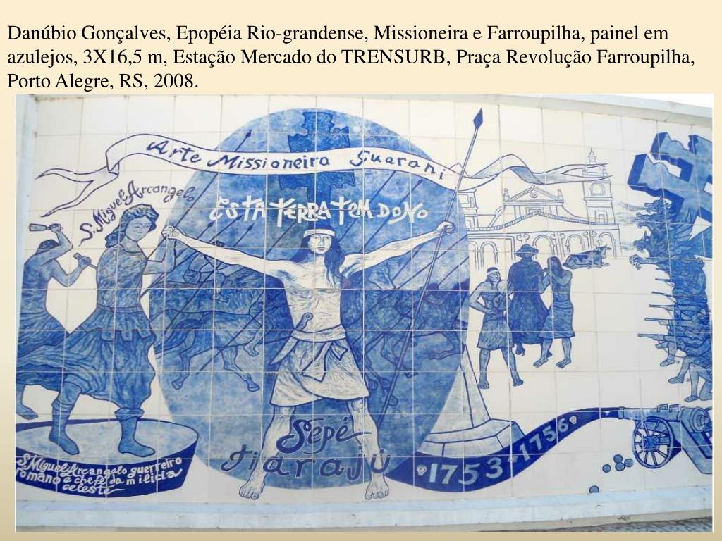 Danúbio Gonçalves, Epopéia Rio-grandense, Missioneira e Farroupilha, painel em azulejos, 3X16,5 m, Estação Mercado do TRENSURB, Praça Revolução Farroupilha, Porto Alegre, RS, 2008.