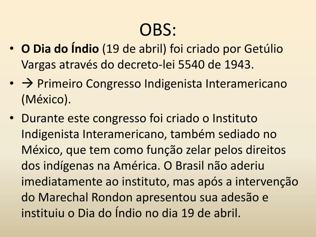 OBS: • O Dia do Índio (19 de abril) foi criado por Getúlio Vargas através do decreto-lei 5540 de 1943. • Primeiro Congresso Indigenista Interamericano (México). • Durante este congresso foi criado o Instituto Indigenista Interamericano, também sediado no México, que tem como função zelar pelos direitos dos indígenas na América. O Brasil não aderiu imediatamente ao instituto, mas após a intervenção do Marechal Rondon apresentou sua adesão e instituiu o Dia do Índio no dia 19 de abril.