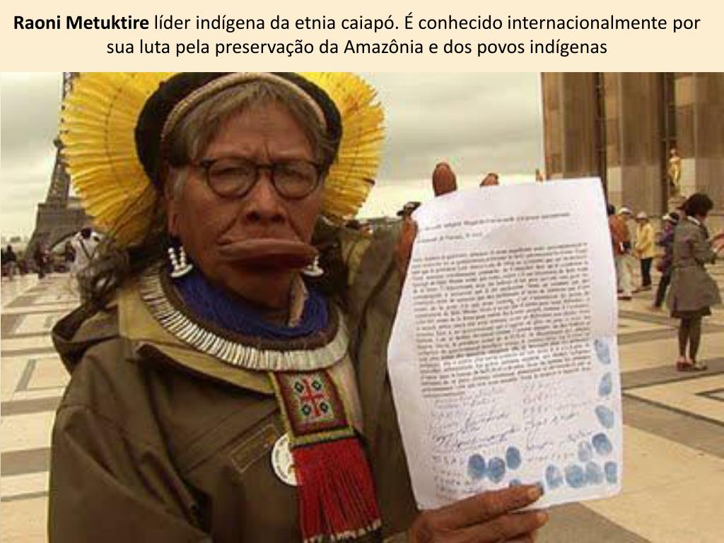 RaoniMetuktirelíder indígena da etnia caiapó. É conhecido internacionalmente por sua luta pela preservação da Amazônia e dos povos indígenas