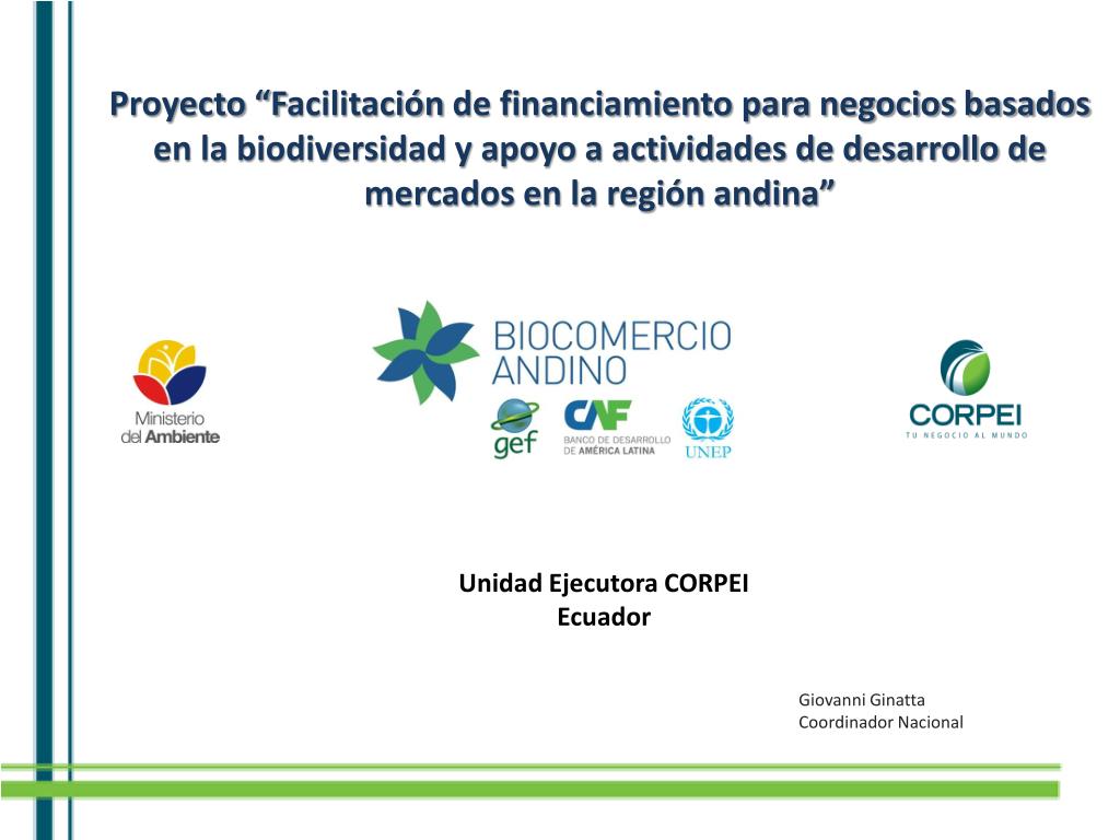 Proyecto “Facilitación de financiamiento para negocios basados en la biodiversidad y apoyo a actividades de desarrollo de mercados en la región andina” Unidad Ejecutora CORPEI Ecuador Giovanni Ginatta Coordinador Nacional