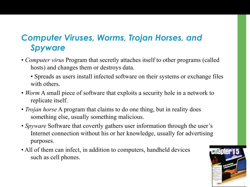 Computer Viruses, Worms, Trojan Horses, and Spyware • • Computer virus Program that secretly attaches itself to other programs (called hosts) and changes them or destroys data. • • Spreads as users install infected software on their systems or exchange files with others. • • Worm A small piece of software that exploits a security hole in a network to replicate itself. • • Trojan horse A program that claims to do one thing, but in reality does something else, usually something malicious. • • Spyware Software that covertly gathers user information through the user’s Internet connection without his or her knowledge, usually for advertising purposes. • • All of them can infect, in addition to computers, handheld devices such as cell phones.