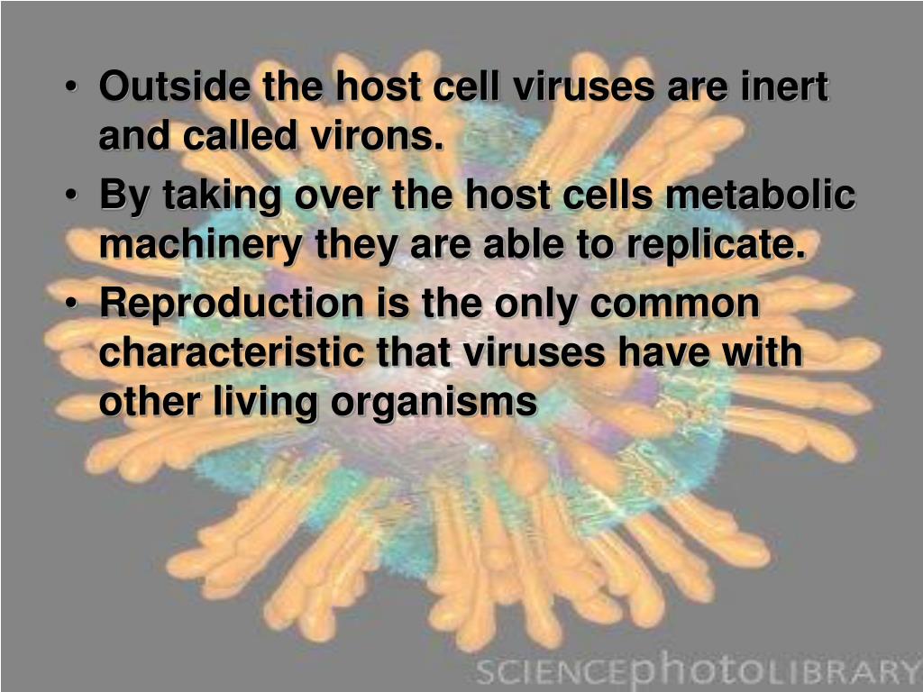 Outside the host cell viruses are inert and called virons. By taking over the host cells metabolic machinery they are able to replicate. Reproduction is the only common characteristic that viruses have with other living organisms