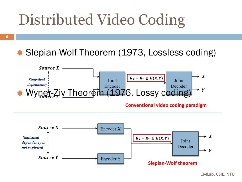 Encoder X Joint Encoder Joint Decoder Joint Decoder Distributed Video Coding • Slepian-Wolf Theorem (1973, Lossless coding) • Wyner-Ziv Theorem (1976, Lossy coding) Encoder Y Conventional video coding paradigm Statistical dependency is not exploited Statistical dependency Slepian-Wolf theorem CMLab, CSIE, NTU