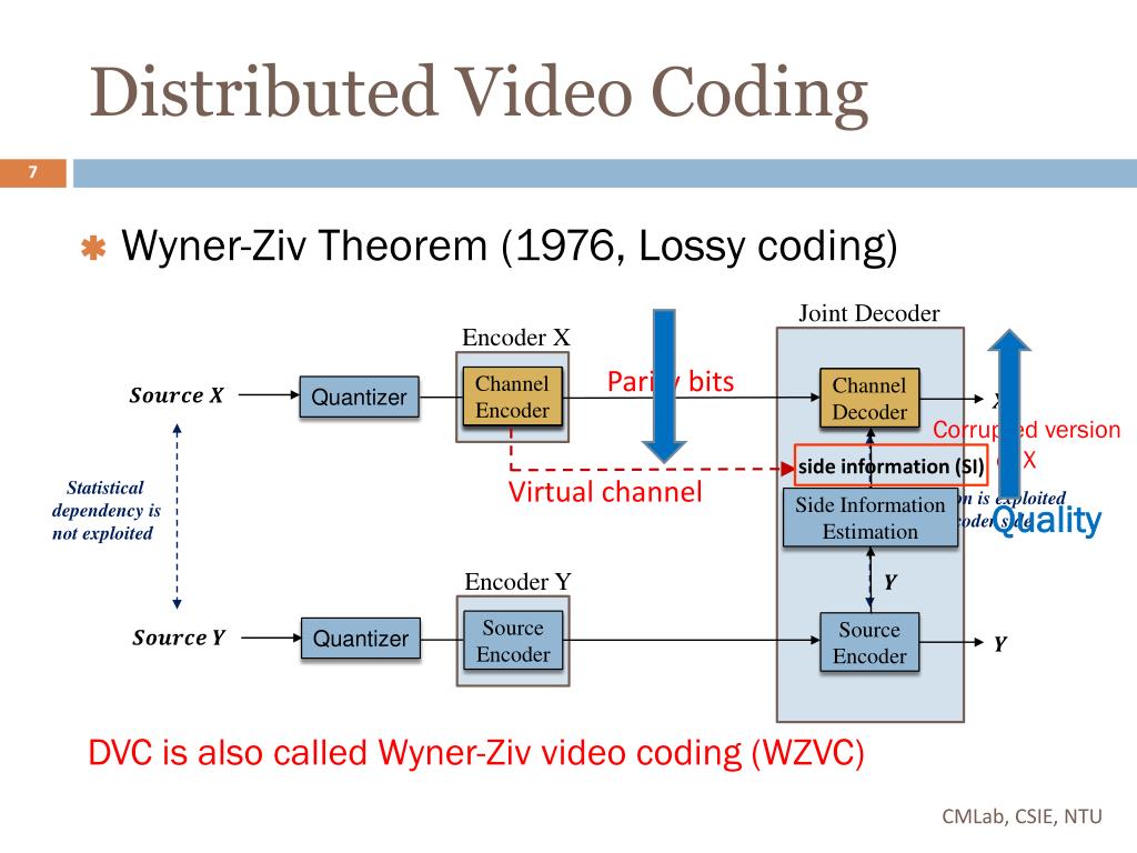 Motivation Encoder-side Past reference frame Future reference frame F( t ) Source X Decoder-side Side Information Estimation F( t ) F( t-1 ) F( t+1 ) CMLab, CSIE, NTU