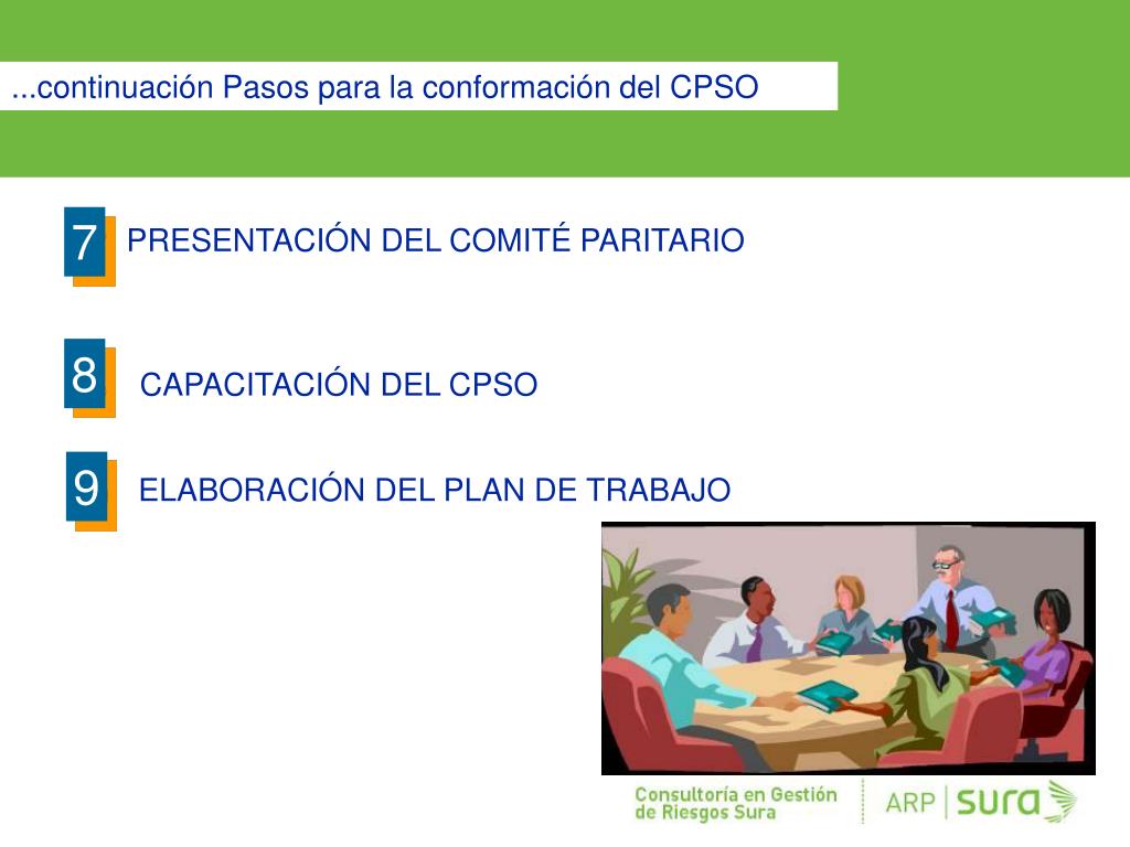 ...continuación Pasos para la conformación del CPSO 7 PRESENTACIÓN DEL COMITÉ PARITARIO CAPACITACIÓN DEL CPSO ELABORACIÓN DEL PLAN DE TRABAJO 8 9