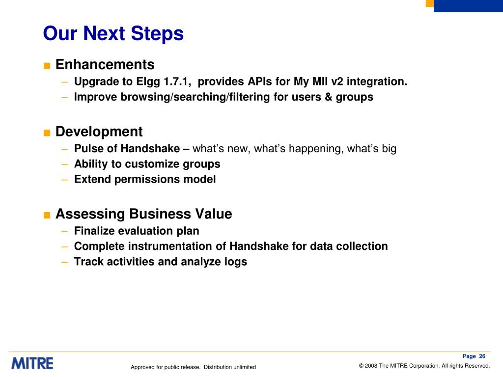 Our Next Steps • Enhancements • Upgrade to Elgg 1.7.1, provides APIs for My MII v2 integration. • Improve browsing/searching/filtering for users & groups • Development • Pulse of Handshake – what’s new, what’s happening, what’s big • Ability to customize groups • Extend permissions model • Assessing Business Value • Finalize evaluation plan • Complete instrumentation of Handshake for data collection • Track activities and analyze logs