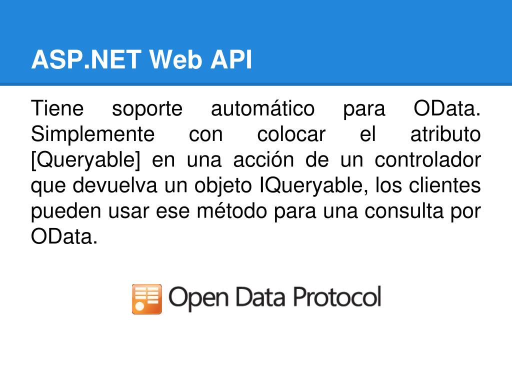 ASP.NET Web API • Tiene soporte automático para OData. Simplemente con colocar el atributo [Queryable] en una acción de un controlador que devuelva un objeto IQueryable, los clientes pueden usar ese método para una consulta por OData.
