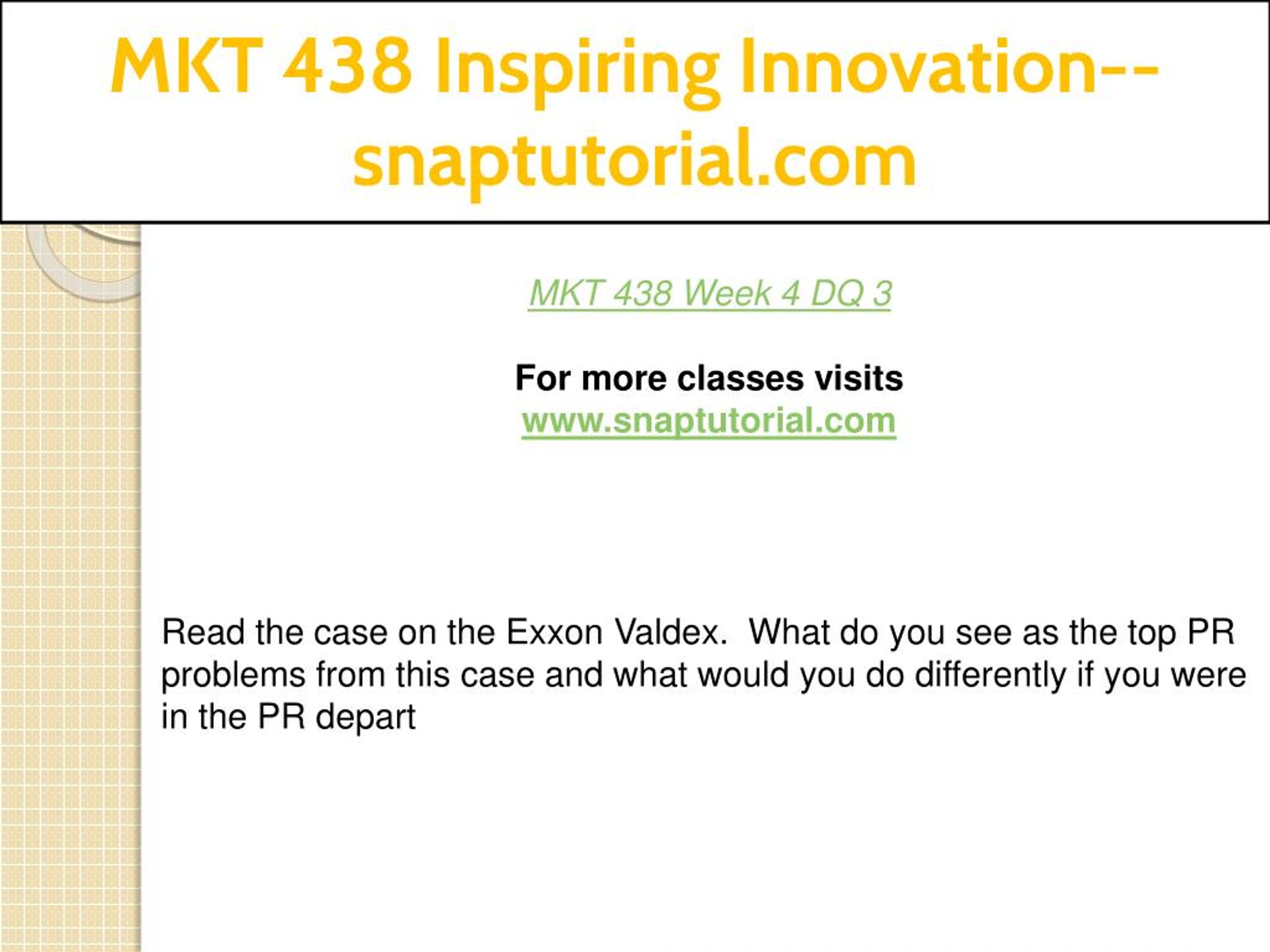 MKT 438 Inspiring Innovation--snaptutorial.com MKT 438 Week 4 DQ 3 For more classes visits www.snaptutorial.com Read the case on the Exxon Valdex. What do you see as the top PR problems from this case and what would you do differently if you were in the PR depart