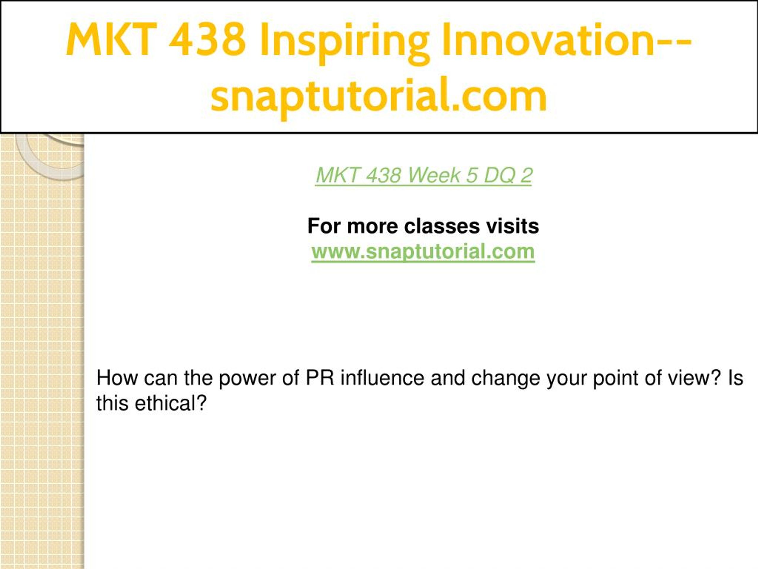 MKT 438 Inspiring Innovation--snaptutorial.com MKT 438 Week 5 DQ 2 For more classes visits www.snaptutorial.com How can the power of PR influence and change your point of view? Is this ethical?