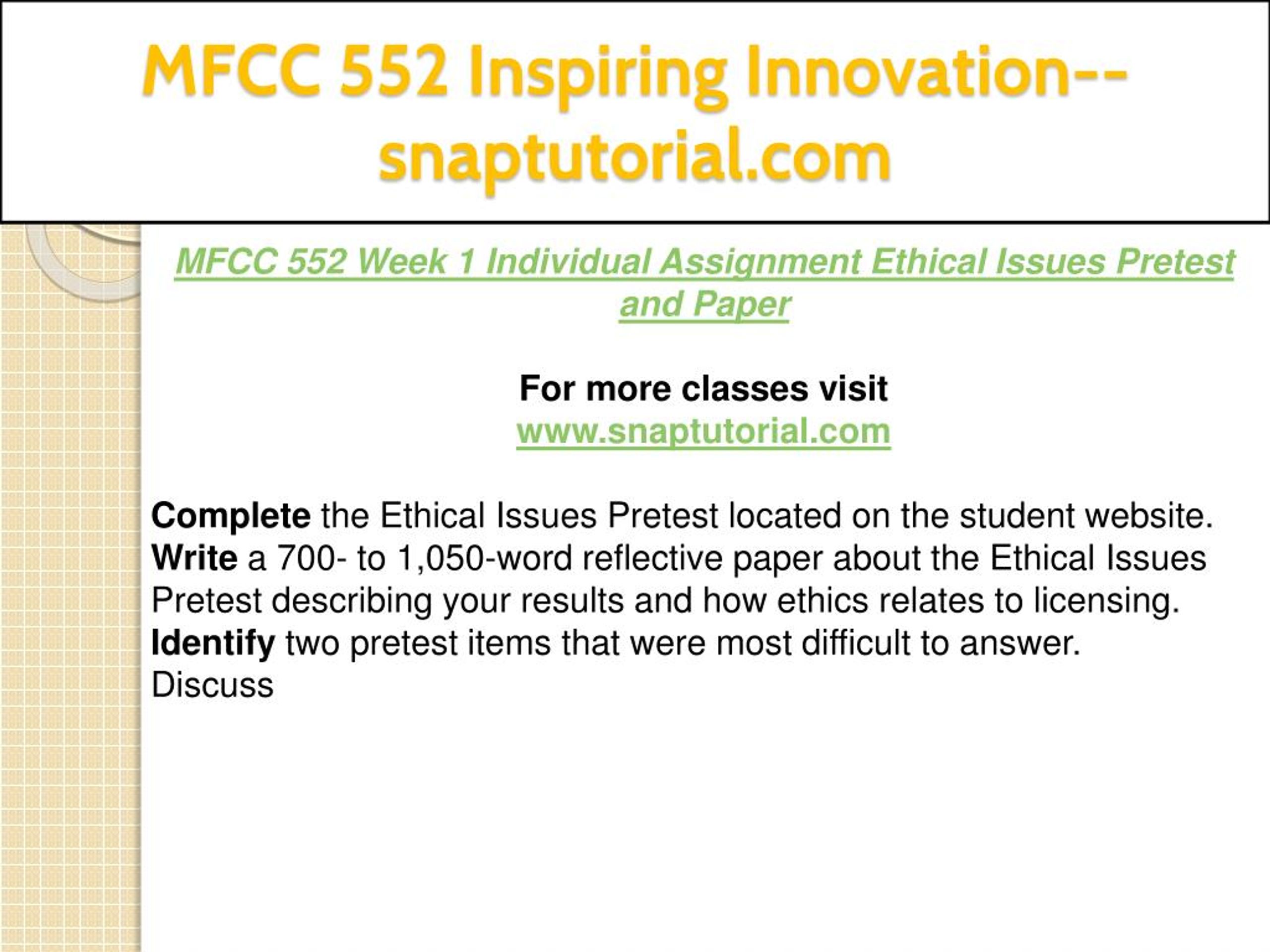 MFCC 552 Inspiring Innovation--snaptutorial.com MFCC 552 Week 1 Individual Assignment Ethical Issues Pretest and Paper For more classes visit www.snaptutorial.com Complete the Ethical Issues Pretest located on the student website. Write a 700- to 1,050-word reflective paper about the Ethical Issues Pretest describing your results and how ethics relates to licensing. Identify two pretest items that were most difficult to answer. Discuss