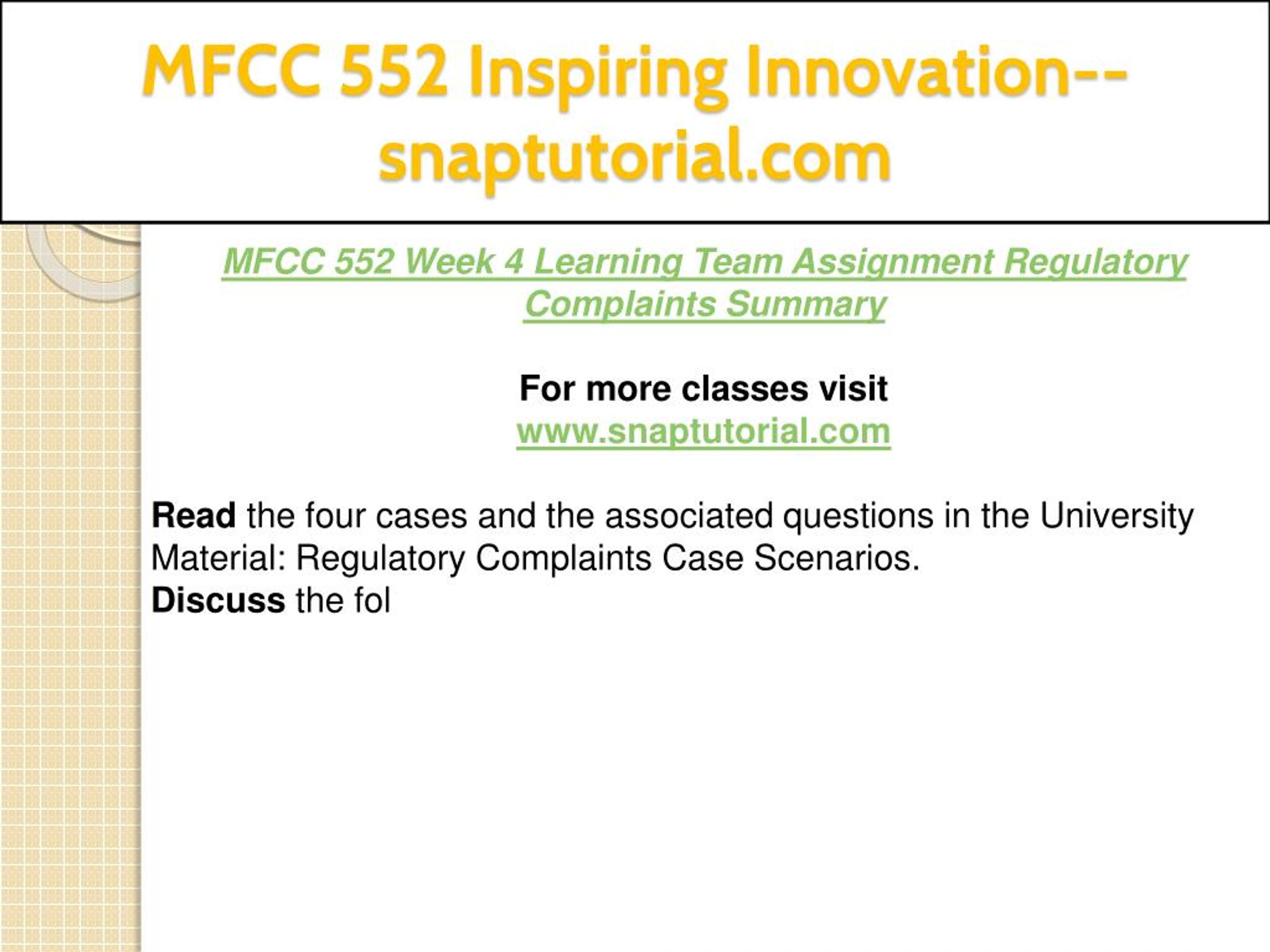 MFCC 552 Inspiring Innovation--snaptutorial.com MFCC 552 Week 4 Learning Team Assignment Regulatory Complaints Summary For more classes visit www.snaptutorial.com Read the four cases and the associated questions in the University Material: Regulatory Complaints Case Scenarios. Discuss the fol