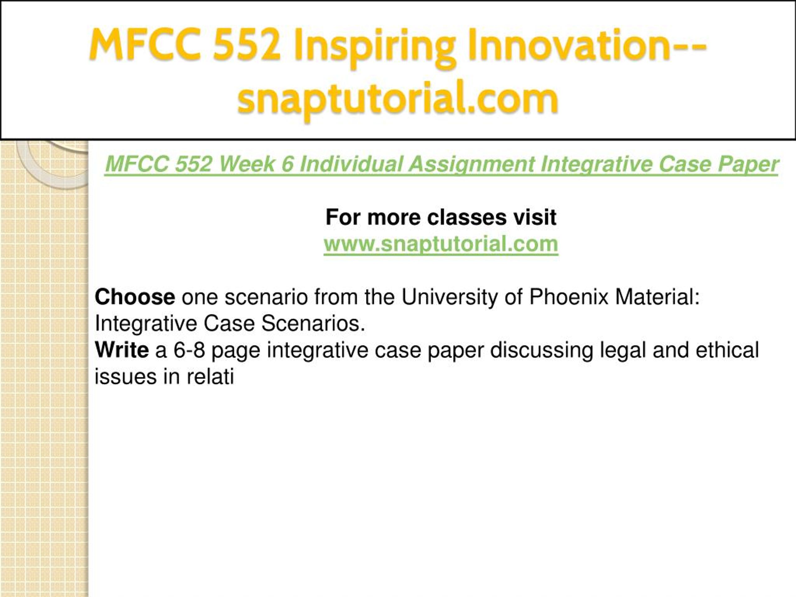 MFCC 552 Inspiring Innovation--snaptutorial.com MFCC 552 Week 6 Individual Assignment Integrative Case Paper For more classes visit www.snaptutorial.com Choose one scenario from the University of Phoenix Material: Integrative Case Scenarios. Write a 6-8 page integrative case paper discussing legal and ethical issues in relati