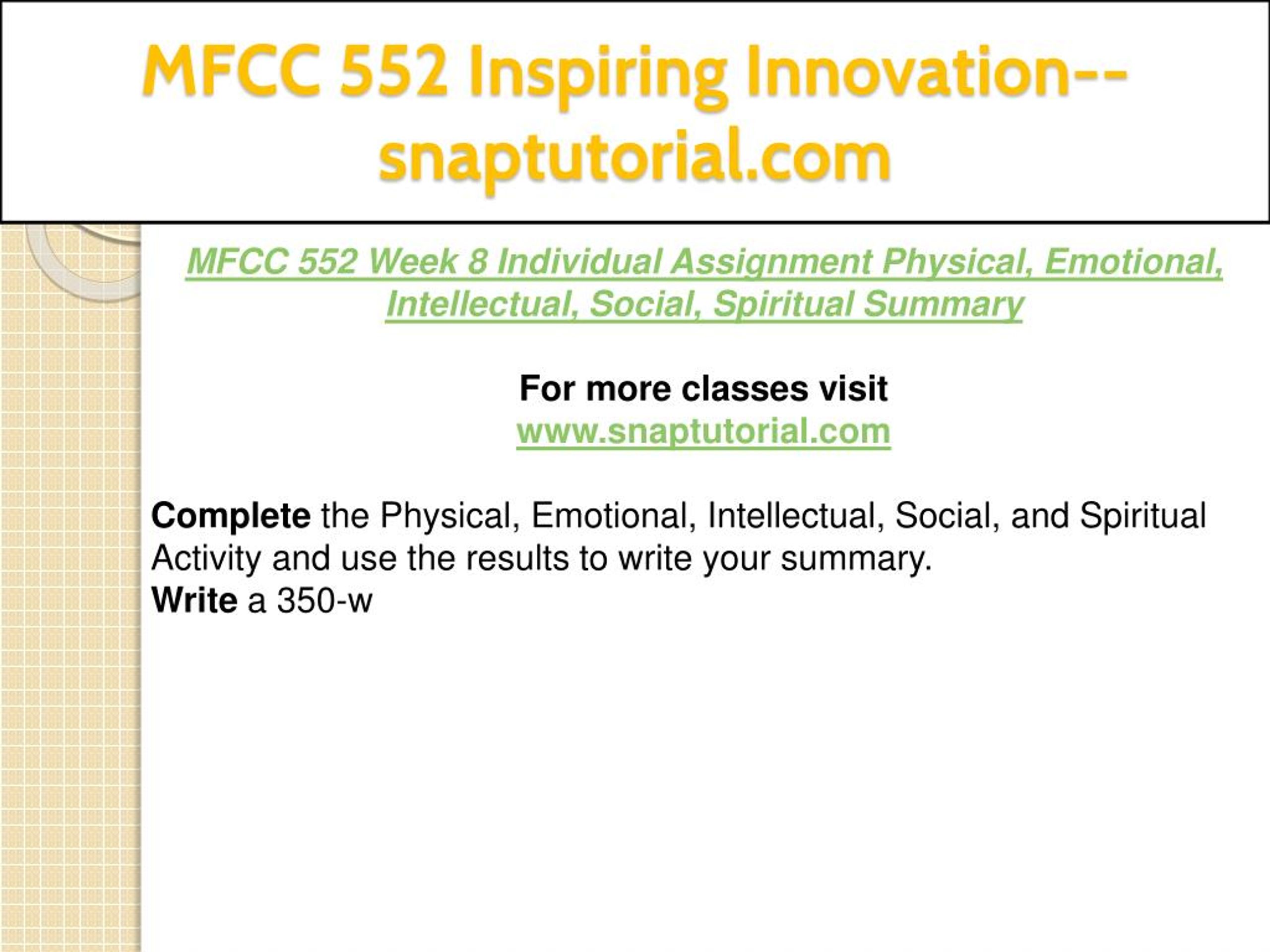 MFCC 552 Inspiring Innovation--snaptutorial.com MFCC 552 Week 8 Individual Assignment Physical, Emotional, Intellectual, Social, Spiritual Summary For more classes visit www.snaptutorial.com Complete the Physical, Emotional, Intellectual, Social, and Spiritual Activity and use the results to write your summary. Write a 350-w
