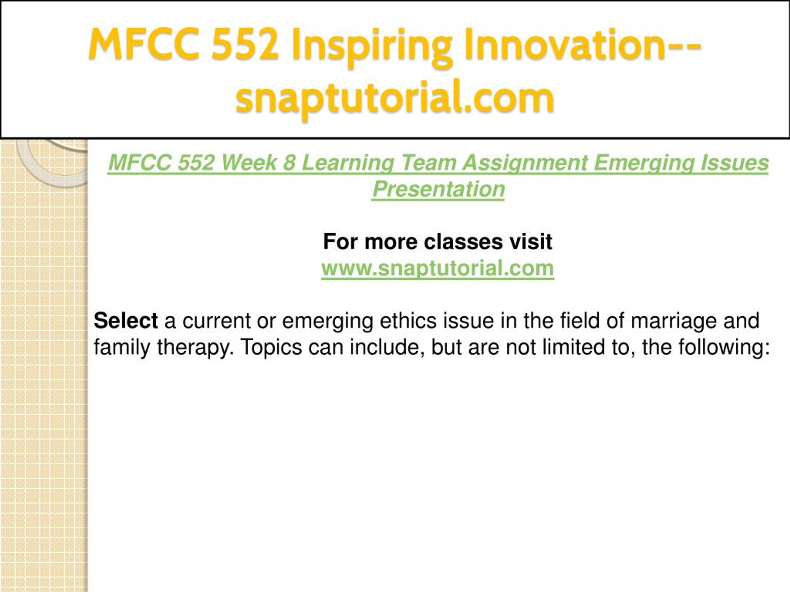 MFCC 552 Inspiring Innovation--snaptutorial.com MFCC 552 Week 8 Learning Team Assignment Emerging Issues Presentation For more classes visit www.snaptutorial.com Select a current or emerging ethics issue in the field of marriage and family therapy. Topics can include, but are not limited to, the following: