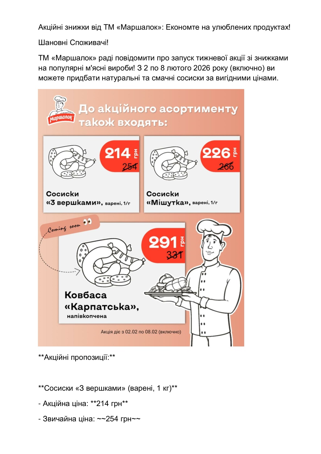 Акційні знижки від ТМ «Маршалок»: Економте на улюблених продуктах! Шановні Споживачі! ТМ «Маршалок» раді повідомити про запуск тижневої акції зі знижками на популярні м'ясні вироби! З 2 по 8 лютого 2026 року (включно) ви можете придбати натуральні та смачні сосиски за вигідними цінами. **Акційні пропозиції:** **Сосиски «З вершками» (варені, 1 кг)** - Акційна ціна: **214 грн** - Звичайна ціна: ~~254 грн~~