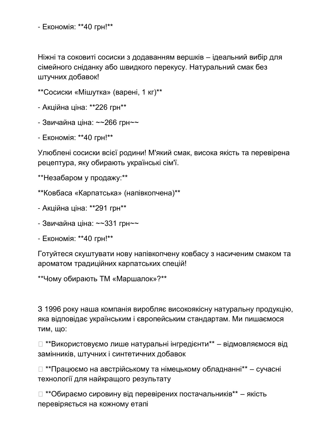 - Економія: **40 грн!** Ніжні та соковиті сосиски з додаванням вершків –ідеальний вибір для сімейного сніданку або швидкого перекусу. Натуральний смак без штучних добавок! **Сосиски «Мішутка» (варені, 1 кг)** - Акційна ціна: **226 грн** - Звичайна ціна: ~~266 грн~~ - Економія: **40 грн!** Улюблені сосиски всієї родини! М'який смак, висока якість та перевірена рецептура, яку обирають українські сім'ї. **Незабаром у продажу:** **Ковбаса «Карпатська» (напівкопчена)** - Акційна ціна: **291 грн** - Звичайна ціна: ~~331 грн~~ - Економія: **40грн!** Готуйтеся скуштувати нову напівкопчену ковбасу з насиченим смаком та ароматом традиційних карпатських спецій! **Чому обирають ТМ «Маршалок»?** З 1996 року наша компанія виробляє високоякісну натуральну продукцію, яка відповідає українським і європейським стандартам. Ми пишаємося тим, що: ✅**Використовуємо лише натуральні інгредієнти** –відмовляємося від замінників, штучних і синтетичних добавок ✅**Працюємо на австрійському та німецькому обладнанні** –сучасні технології для найкращогорезультату ✅**Обираємо сировину від перевірених постачальників** –якість перевіряється на кожному етапі