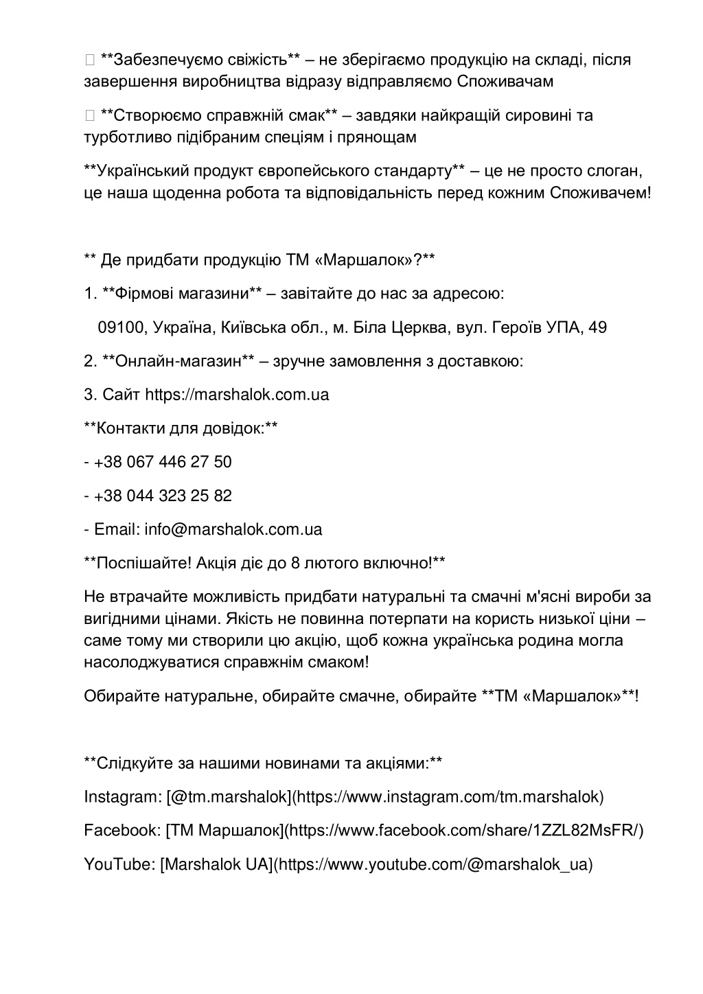✅**Забезпечуємо свіжість** –не зберігаємо продукцію на складі, після завершення виробництва відразу відправляємо Споживачам ✅**Створюємо справжнійсмак** –завдяки найкращій сировині та турботливо підібраним спеціям і прянощам **Український продукт європейського стандарту** –це не просто слоган, це наша щоденна робота та відповідальність перед кожним Споживачем! ** Де придбати продукцію ТМ «Маршалок»?** 1. **Фірмові магазини** –завітайте до нас за адресою: 09100, Україна, Київська обл., м. Біла Церква, вул. Героїв УПА, 49 2. **Онлайн-магазин** –зручне замовлення з доставкою: 3. Сайт https://marshalok.com.ua **Контакти для довідок:** - +38 067 446 27 50 - +38 044 323 25 82 - Email: info@marshalok.com.ua **Поспішайте! Акція діє до 8 лютого включно!** Не втрачайте можливість придбати натуральні та смачні м'ясні вироби за вигідними цінами. Якість не повинна потерпати на користь низької ціни – саме тому ми створили цю акцію, щоб кожна українська родина могла насолоджуватися справжнім смаком! Обирайте натуральне, обирайте смачне, обирайте **ТМ «Маршалок»**! **Слідкуйте за нашими новинами та акціями:** Instagram: [@tm.marshalok](https://www.instagram.com/tm.marshalok) Facebook: [ТМ Маршалок](https://www.facebook.com/share/1ZZL82MsFR/) YouTube: [Marshalok UA](https://www.youtube.com/@marshalok_ua)