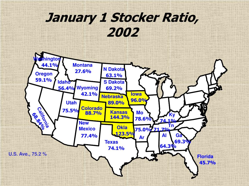 California January 1 Stocker Ratio, 2002 Washington 44.1% Montana N Dakota 27.6% Oregon 63.1% 59.1% Idaho S Dakota Wyoming 56.4% 69.2% 42.1% Iowa Nebraska 96.0% Utah 89.0% Colorado 75.5% Kansas Mo 88.7% Ky 144.3% 78.6% 74.1% 68.84% New Mexico Tn Okla 75.0% 71.7% 123.5% Al Ga 77.4% Ar 69.3% Texas 64.3% 74.1% U.S. Ave., 75.2 % Florida 45.7%