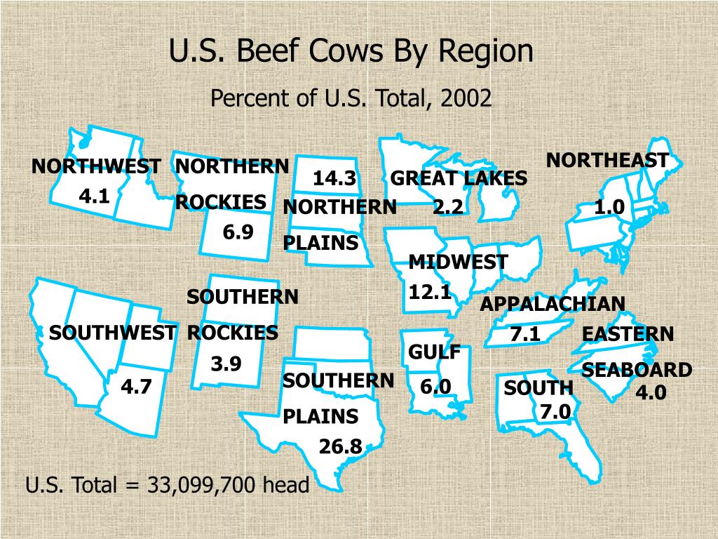 U.S. Beef Cows By Region Percent of U.S. Total, 2002 NORTHEAST NORTHWEST NORTHERN ROCKIES 14.3 GREAT LAKES 4.1 NORTHERN PLAINS 2.2 1.0 6.9 MIDWEST 12.1 SOUTHERN ROCKIES APPALACHIAN SOUTHWEST 7.1 EASTERN SEABOARD GULF 3.9 SOUTHERN PLAINS 4.7 6.0 SOUTH 4.0 7.0 26.8 U.S. Total = 33,099,700 head