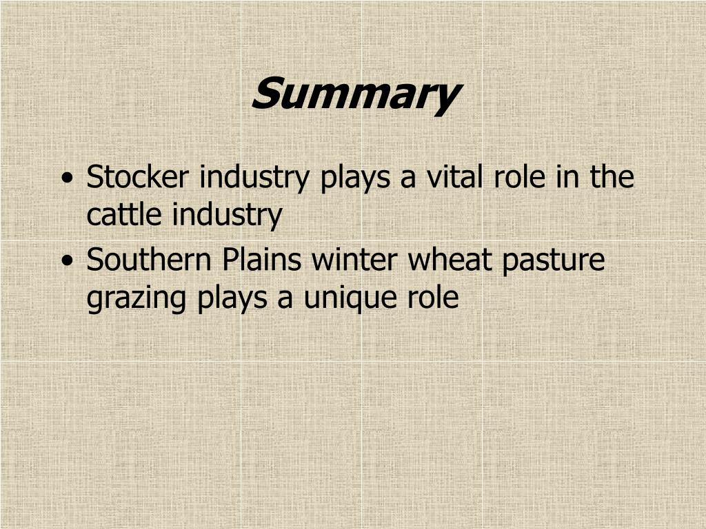 Summary • Stocker industry plays a vital role in the cattle industry • Southern Plains winter wheat pasture grazing plays a unique role
