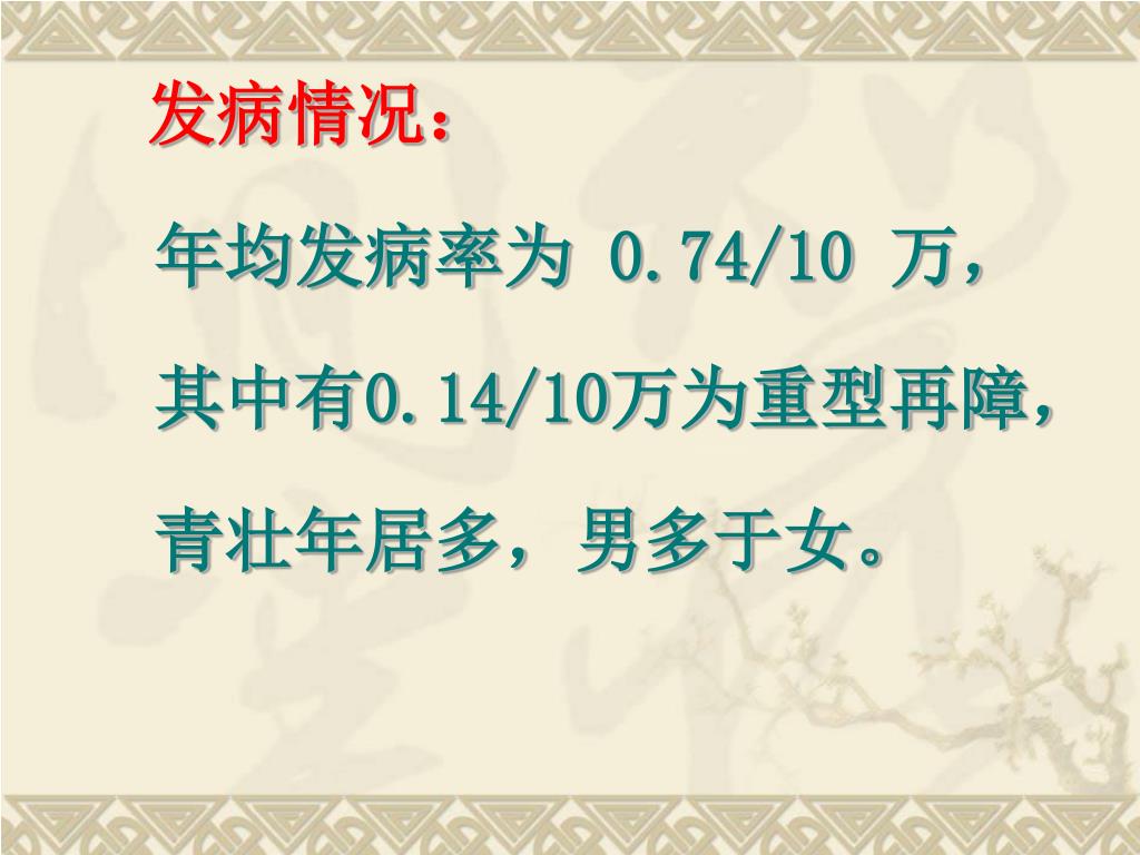 发病情况: 年均发病率为 0.74/10 万, 其中有0.14/10万为重型再障, 青壮年居多,男多于女。