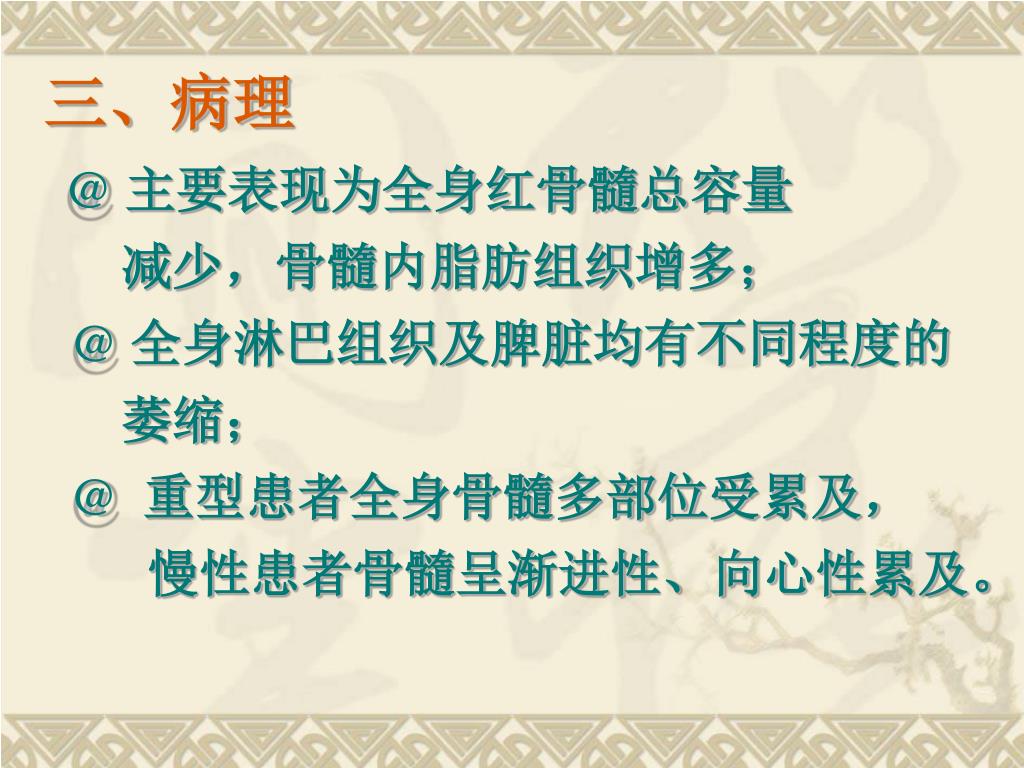 三、病理 @ 主要表现为全身红骨髓总容量 减少,骨髓内脂肪组织增多; @ 全身淋巴组织及脾脏均有不同程度的 萎缩; @ 重型患者全身骨髓多部位受累及, 慢性患者骨髓呈渐进性、向心性累及。