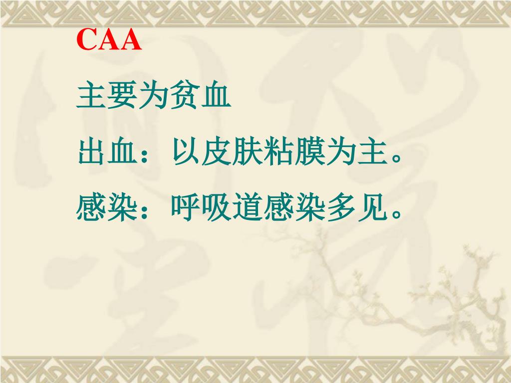 CAA 主要为贫血 出血:以皮肤粘膜为主。 感染:呼吸道感染多见。