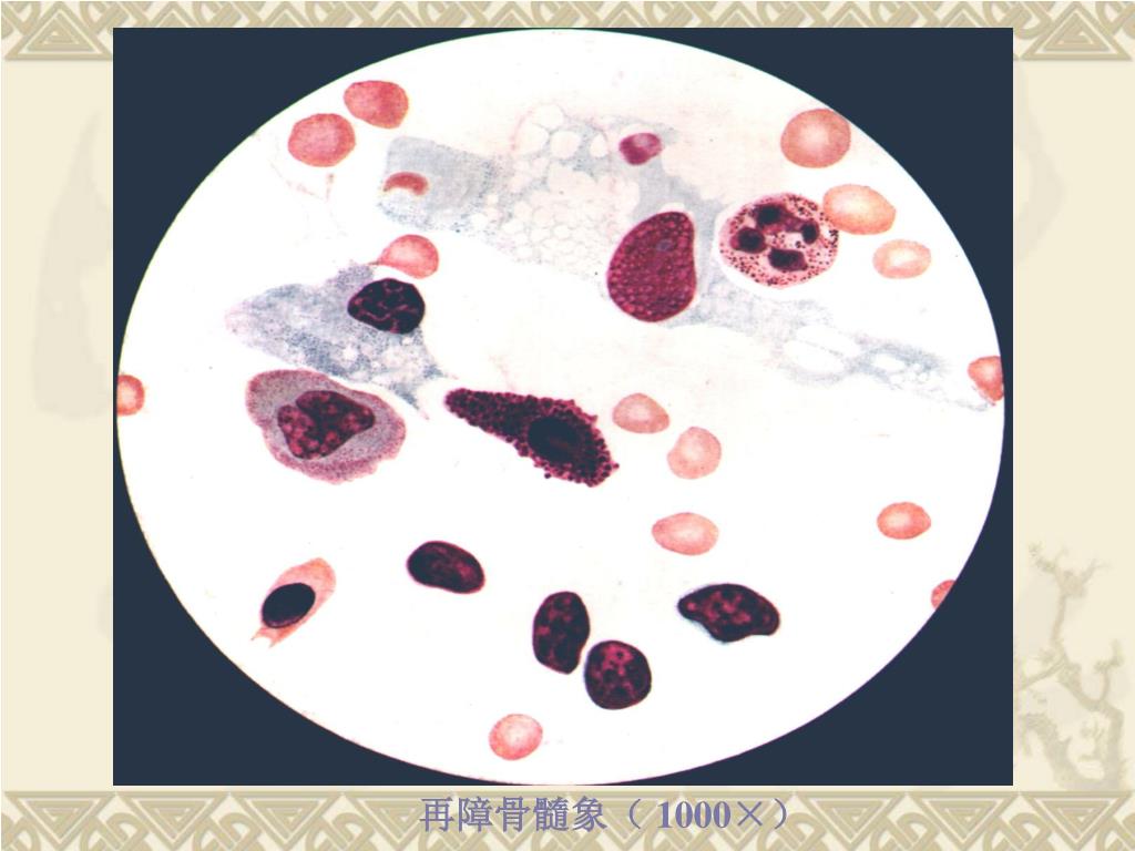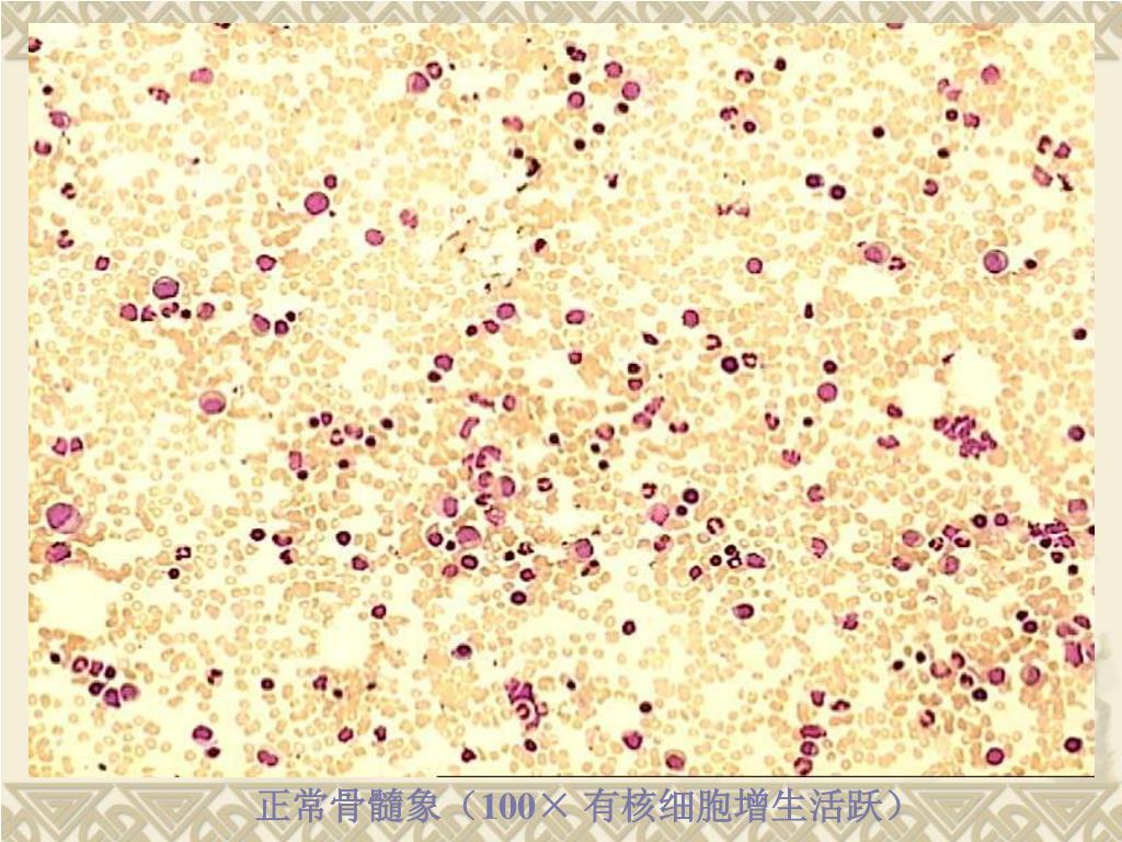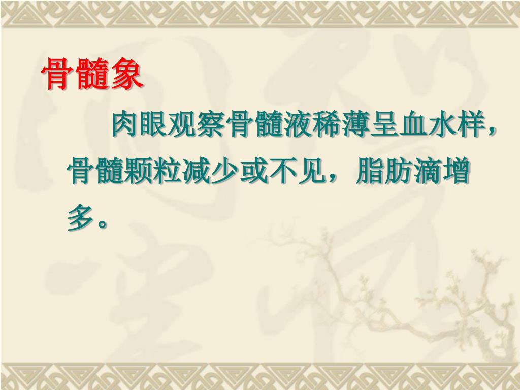 骨髓象 • 肉眼观察骨髓液稀薄呈血水样,骨髓颗粒减少或不见,脂肪滴增多。