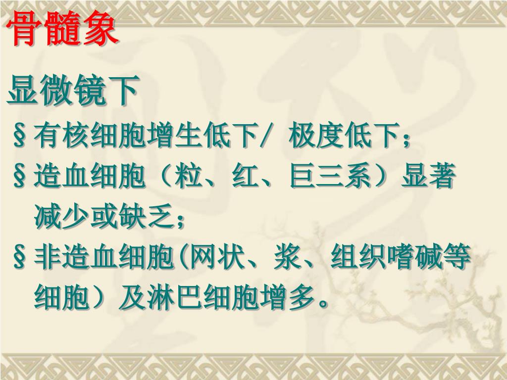 骨髓象 显微镜下 §有核细胞增生低下/ 极度低下; §造血细胞(粒、红、巨三系)显著 减少或缺乏; §非造血细胞(网状、浆、组织嗜碱等 细胞)及淋巴细胞增多。
