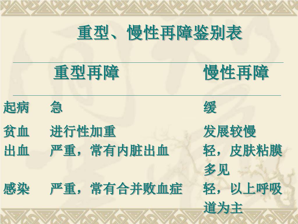 重型、慢性再障鉴别表 重型再障 慢性再障 起病 急 缓 贫血 进行性加重 发展较慢 出血 严重,常有内脏出血 轻,皮肤粘膜 多见 感染 严重,常有合并败血症轻,以上呼吸 道为主
