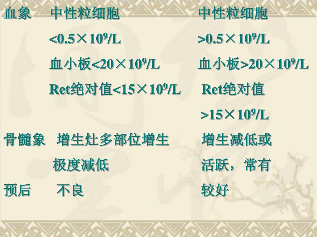 血象 中性粒细胞 中性粒细胞 <0.5×109/L >0.5×109/L 血小板<20×109/L 血小板>20×109/L Ret绝对值<15×109/L Ret绝对值 >15×109/L 骨髓象 增生灶多部位增生 增生减低或 极度减低 活跃,常有 预后 不良 较好