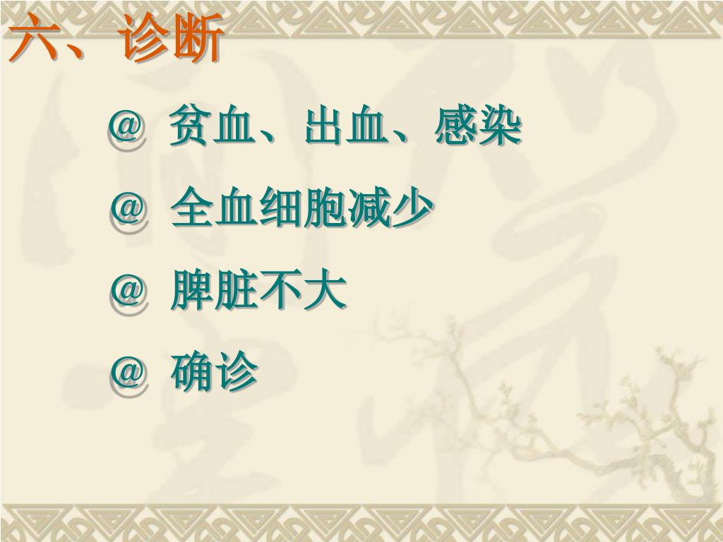 六、诊断 @ 贫血、出血、感染 @ 全血细胞减少 @ 脾脏不大 @ 确诊