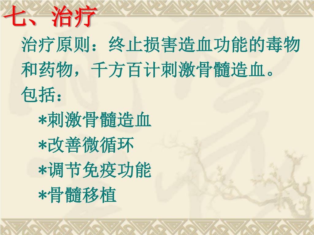七、治疗 治疗原则:终止损害造血功能的毒物 和药物,千方百计刺激骨髓造血。 包括: *刺激骨髓造血 *改善微循环 *调节免疫功能 *骨髓移植