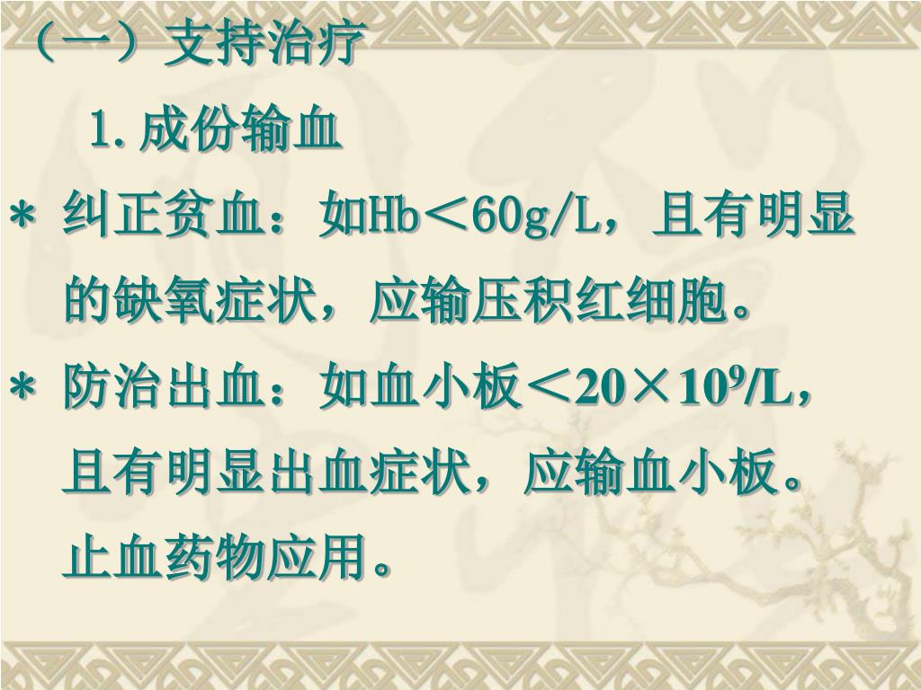 (一)支持治疗 1.成份输血 * 纠正贫血:如Hb<60g/L,且有明显 的缺氧症状,应输压积红细胞。 * 防治出血:如血小板<20×109/L, 且有明显出血症状,应输血小板。 止血药物应用。