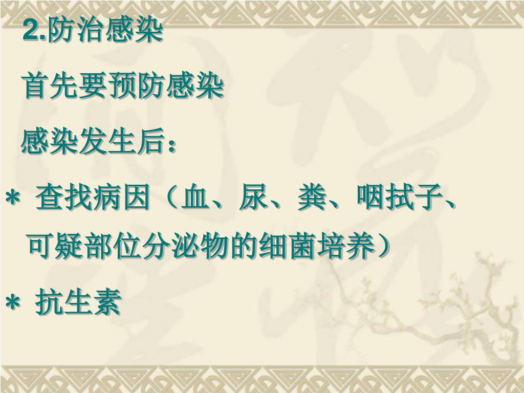 2.防治感染 首先要预防感染 感染发生后: * 查找病因(血、尿、粪、咽拭子、可疑部位分泌物的细菌培养) * 抗生素