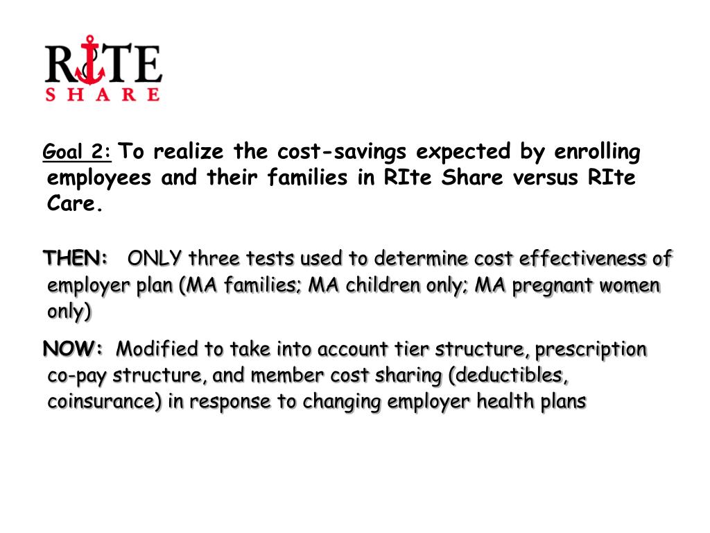 Goal 2:To realize the cost-savings expected by enrolling employees and their families in RIte Share versus RIte Care. THEN:ONLY three tests used to determine cost effectiveness of employer plan (MA families; MA children only; MA pregnant women only) NOW: Modified to take into account tier structure, prescription co-pay structure, and member cost sharing (deductibles, coinsurance) in response to changing employer health plans
