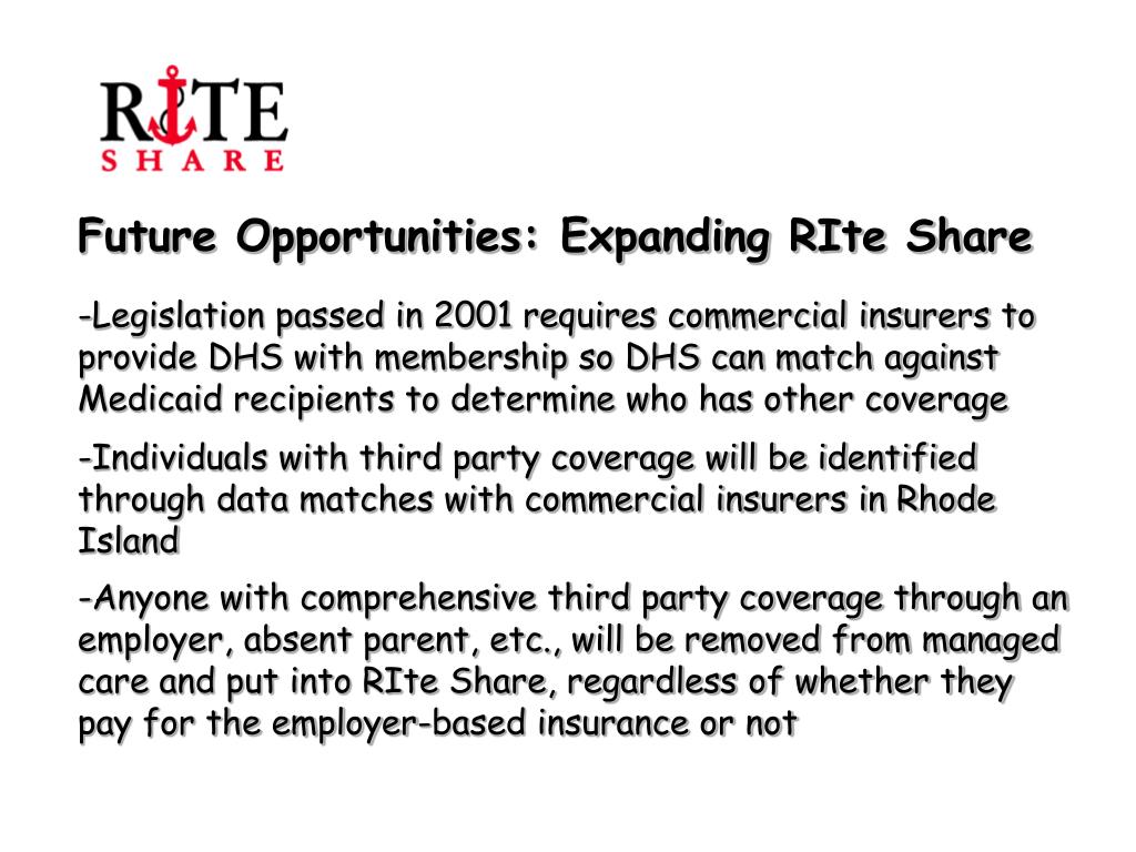 Future Opportunities: Expanding RIte Share • Legislation passed in 2001 requires commercial insurers to provide DHS with membership so DHS can match against Medicaid recipients to determine who has other coverage • Individuals with third party coverage will be identified through data matches with commercial insurers in Rhode Island • Anyone with comprehensive third party coverage through an employer, absent parent, etc., will be removed from managed care and put into RIte Share, regardless of whether they pay for the employer-based insurance or not