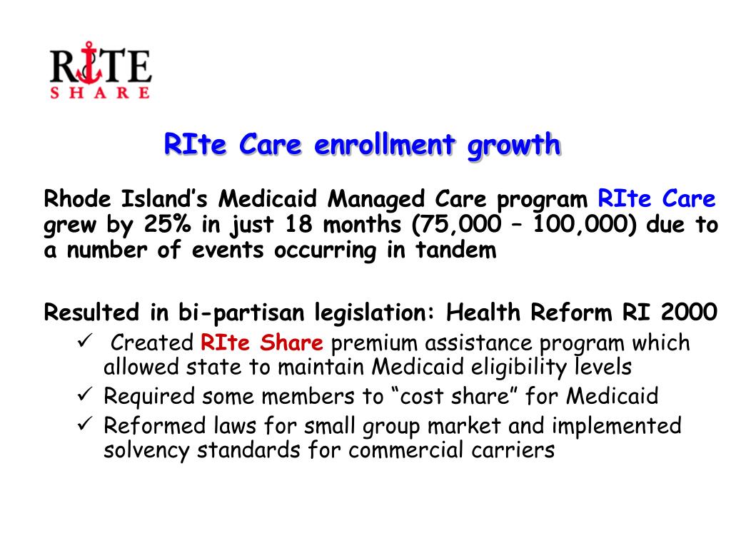 RIte Care enrollment growth • Rhode Island’s Medicaid Managed Care program RIte Caregrew by 25% in just 18 months (75,000 – 100,000) due to a number of events occurring in tandem • Resulted in bi-partisan legislation: Health Reform RI 2000 • Created RIte Share premium assistance program which allowed state to maintain Medicaid eligibility levels • Required some members to “cost share” for Medicaid • Reformed laws for small group market and implemented solvency standards for commercial carriers