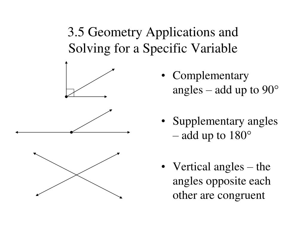 3.5 Geometry Applications and Solving for a Specific Variable • Complementary angles – add up to 90 • Supplementary angles – add up to 180 • Vertical angles – the angles opposite each other are congruent