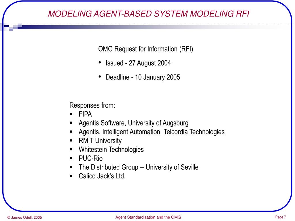 MODELING AGENT-BASED SYSTEM MODELING RFI • OMG Request for Information (RFI) • Issued - 27 August 2004 • Deadline - 10 January 2005 Responses from: • FIPA • Agentis Software, University of Augsburg • Agentis, Intelligent Automation, Telcordia Technologies • RMIT University • Whitestein Technologies • PUC-Rio • The Distributed Group -- University of Seville • Calico Jack's Ltd. Agent Standardization and the OMG