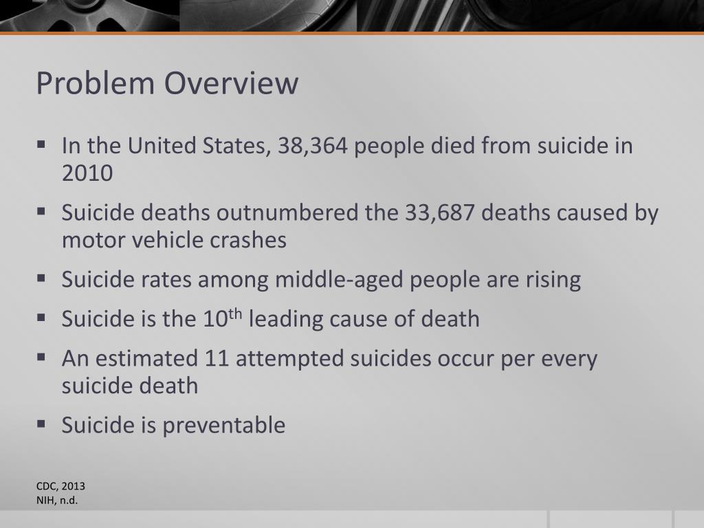 Problem Overview • In the United States, 38,364 people died from suicide in 2010 • Suicide deaths outnumbered the 33,687 deaths caused by motor vehicle crashes • Suicide rates among middle-aged people are rising • Suicide is the 10th leading cause of death • An estimated 11 attempted suicides occur per every suicide death • Suicide is preventable CDC, 2013 NIH, n.d.