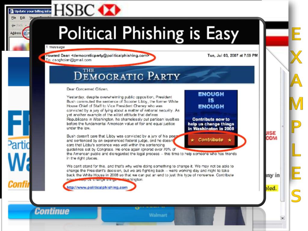 DO YOU LOVE FISHING. OR. “PHISHING” ?. WHAT IS PHISHING? . HOW DOES PHISHING HAPPEN?. SCENARIO 1. HOW DOES PHISHING HAPPEN?. YOU HAVE BEEN PHISHED! THANK YOU FOR YOUR GENEROSITY…. SCENARIO 2. HOW TO DETECT SUSPICIOUS WEB SITES???. EXAMPLES. ~ TYPES OF PHISHING ~. PHARMING: