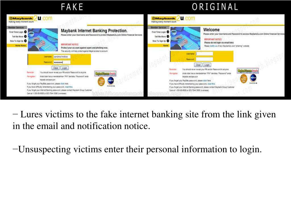 Example of phishing cases • Maybank2u.com became victim to phishing culprits in 2008. • Notification sent through the fake Maybank website and emails sent to victims.