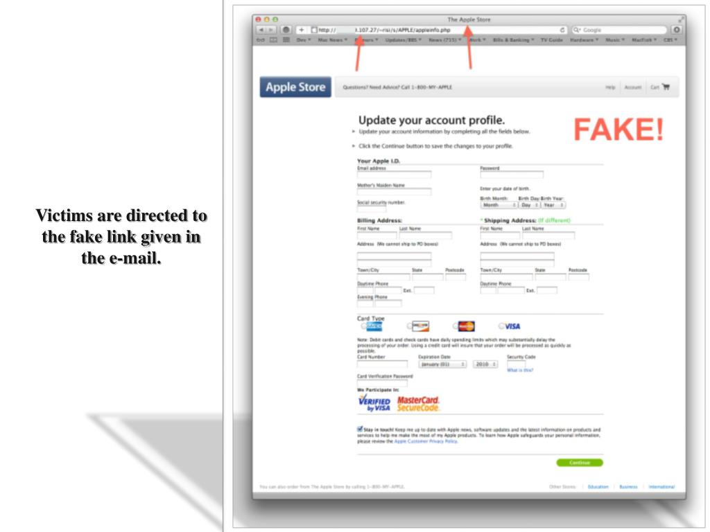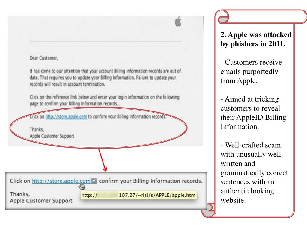 2. Apple was attacked by phishers in 2011. • Customers receive emails purportedly from Apple. • Aimed at tricking customers to reveal their AppleID Billing Information. • Well-crafted scam with unusually well written and grammatically correct sentences with an authentic looking website.